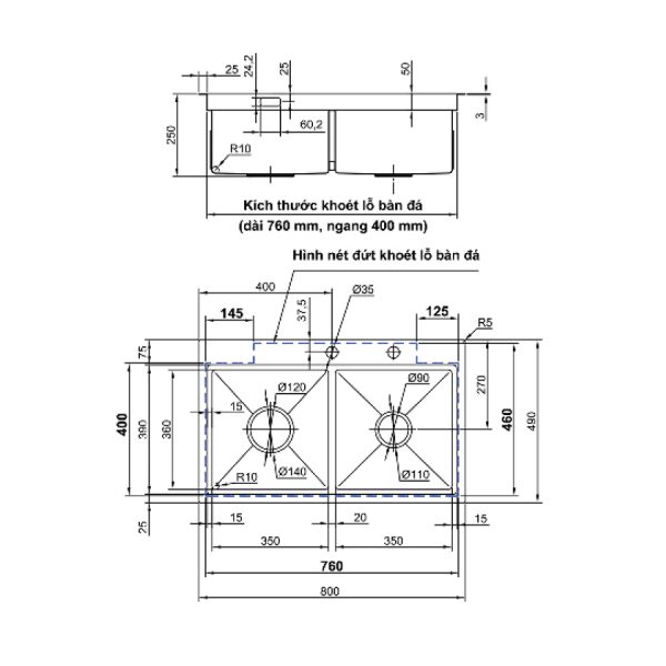 | Chiều dài chậu chén | Khoảng 80-89cm |