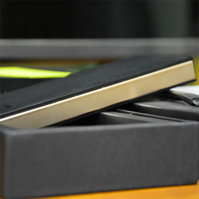 Điểm nhấn của thiết kế là dải kim loại màu vàng đồng nằm bên hông chiếc sạc dự phòng,