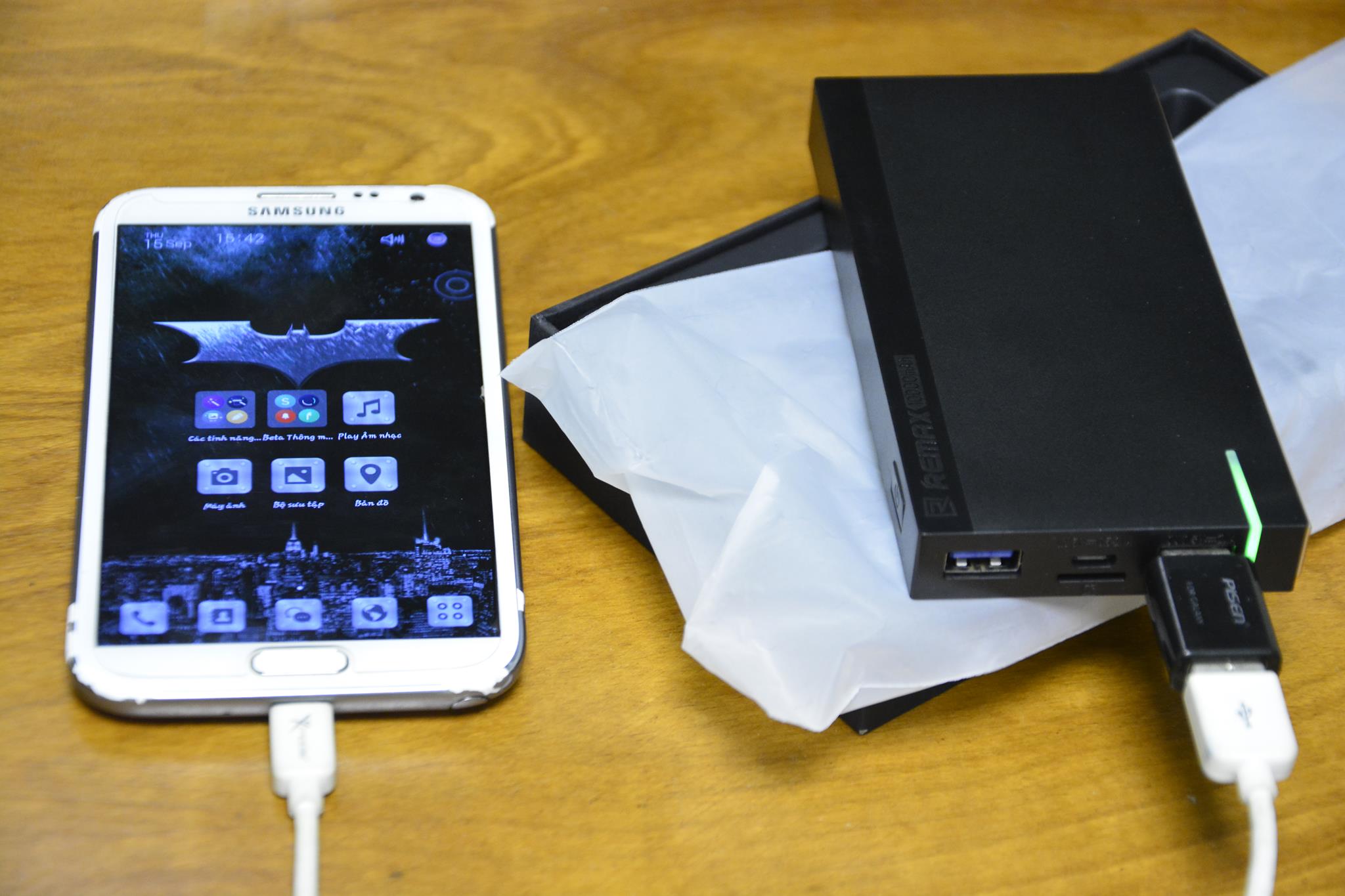 Với 10.000 mah và khả năng sạc ổn định, chiếc sạc có khả năng sạc đầy chiếc galaxy note 2 trong ảnh