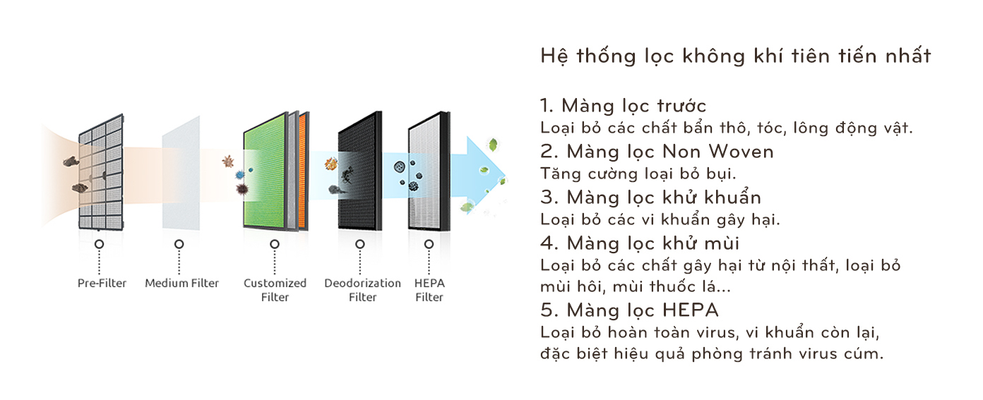 Hệ thống lọc không khí 5 bước với màng lọc HEPA tân tiến giúp máy lọc không khí Coway TUBA (AP-3008FH) loại bỏ 99% bụi, khói thuốc lá, virus, vi khuẩn,... Không những thế, với lớp lọc loại bỏ mùi, máy có khả năng hút và khử mùi mạnh mẽ. Bảo vệ môi trường xung quanh bạn luôn trong lành. Để tăng hiệu suất lọc, máy còn được trang bị công nghệ tiên tiến tích hợp AI điều chỉnh luồng khí để hút và xả khí hợp lý.