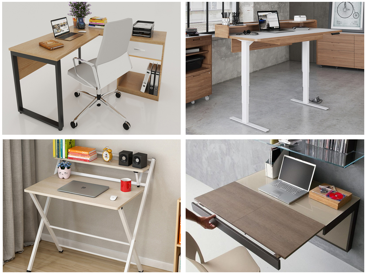 - Xét theo kiểu dáng, tính năng: bàn gấp gọn, bàn chữ L, bàn nâng hạ độ cao (năng hạ thông minh tự động hoặc cơ), bàn tích hợp ngăn tủ chứa đồ, bàn gắn tường...