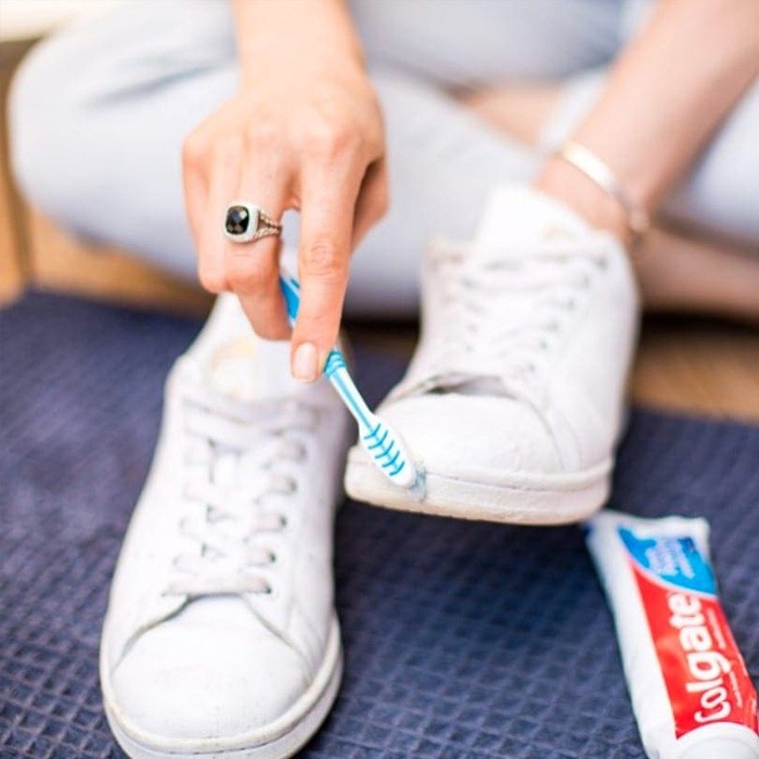 Đây là vị trí dễ lấm bẩn nhất của đôi giày, thật khó chịu khi thấy mũi giày bị đạp lên một dấu chân đen xì đúng không nào. Hãy sử dụng một lượng kem đánh răng không gel và 1 cái bàn chải đánh răng cũ. Sau khi kỳ cọ mũi giày hoặc những phần cần làm sạch, bạn hãy dùng một miếng vải ẩm lau sạch những bọt kem còn sót lại.