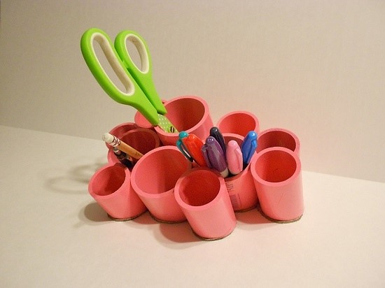 Bạn chỉ cần dung những ống nhựa PVC và đo chiều cao phù hợp với các dụng cụ học tập sau đó cắt mà mài nhẵn mặt cắt tránh cứa vào tay. Dùng keo dán nhựa để gắn chúng lại với nhau.
