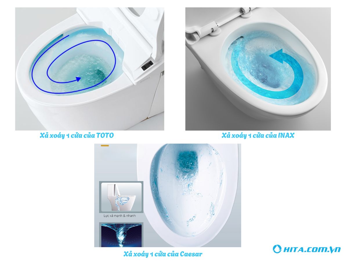 Hai loại xả xoáy thông dụng nhất là xả xoáy 1 cửa và 2 cửa. Với xả xoáy 1 cửa, nước được phun từ một cửa xả lớn đặt lệch về một bên vành bồn. Với bồn cầu TOTO, lỗ xả thường khá lớn với góc phun được tính toán cẩn thận để tạo dòng xoáy sâu, tập trung lực vào đáy bồn, mang đến cảm giác xả gọn và dứt khoát. INAX lại tạo dòng xoáy trải rộng hơn, giúp làm sạch thành bồn tốt hơn nhưng lực xả nhẹ hơn bồn cầu TOTO một chút. Trong khi đó, Caesar cân bằng giữa hai yếu tố, phù hợp với áp lực nước trung bình nhưng hiệu quả phụ thuộc khá nhiều vào lượng nước xả.